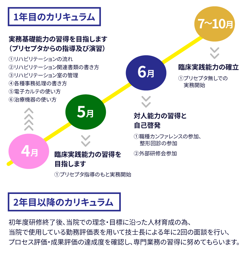 リハビリテーション科研修プログラム リハビリテーション科の基本業務の習得にあたっては、初年度3か月から半年にかけて一人で業務ができるように、実際業務の修練に努めてもらいます。新人職員1名に対し、3年以上臨床経験を有する理学療法士(以下、「プリセプタ」)1名が教育を受け持ち、指導を行っていきます。